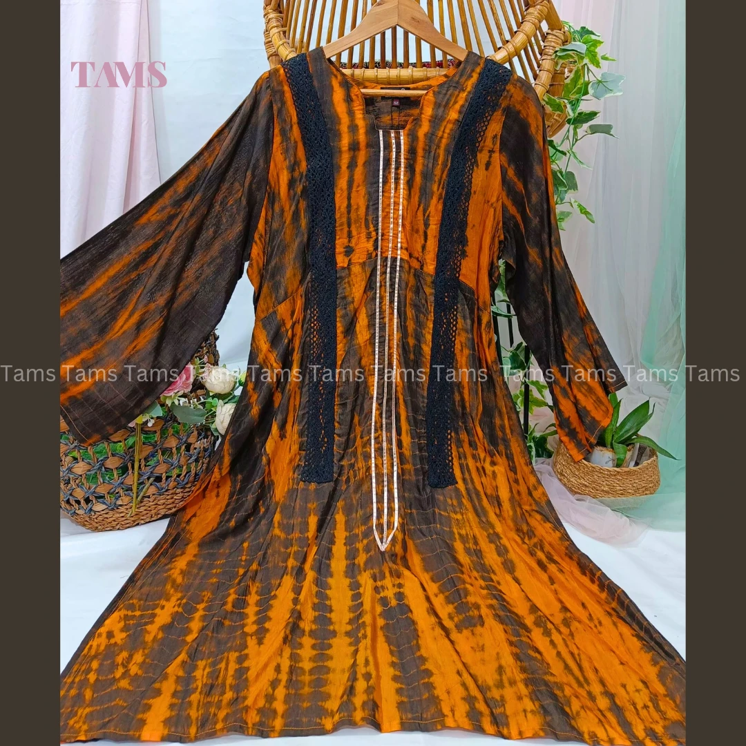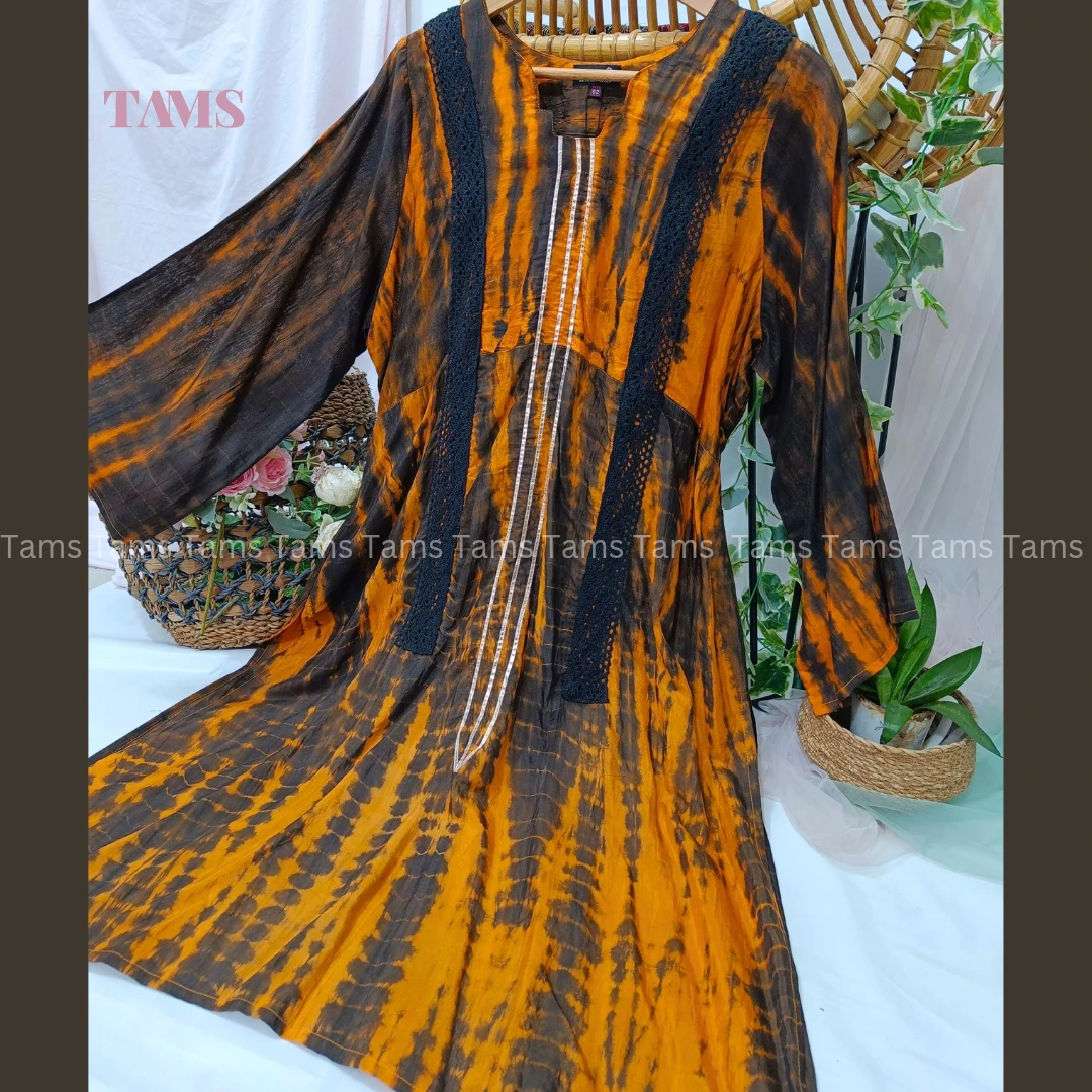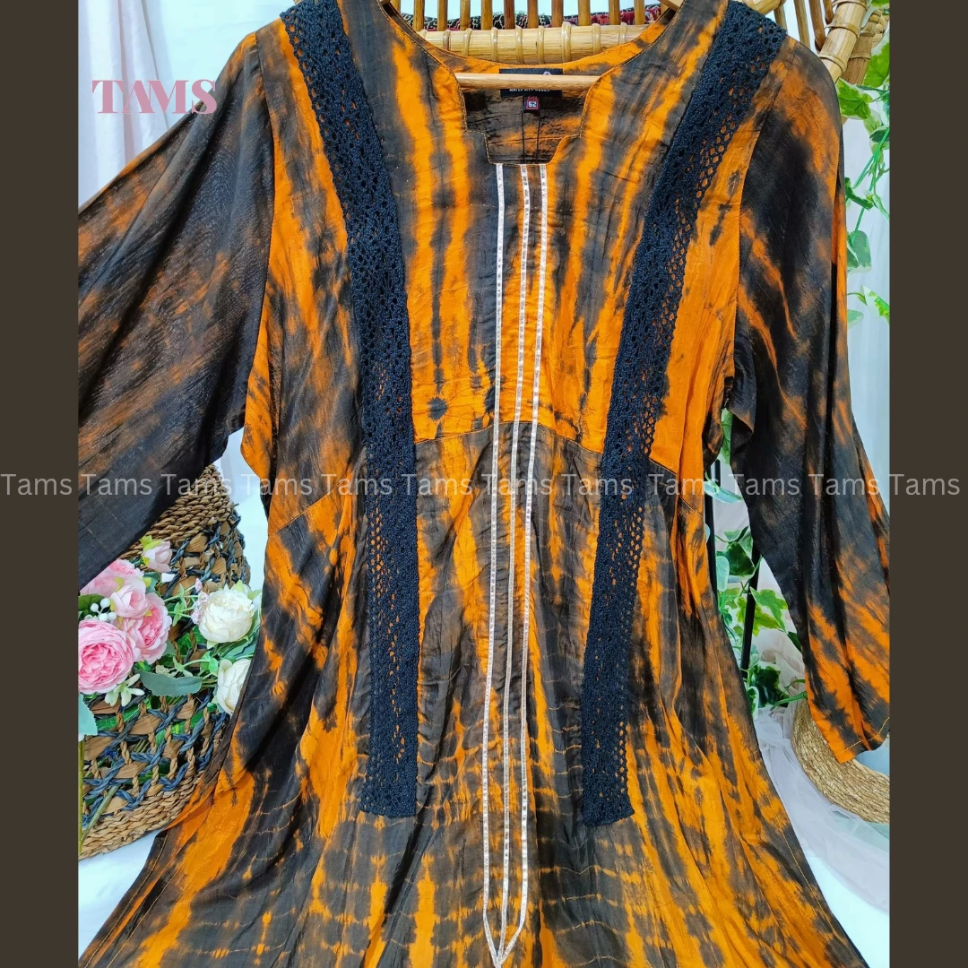 সিল্ক কাপড়ে বাটিক করা, সাথে মেশিনে করা লেইস ও জরিলেসের ডিজাইন রয়েছে